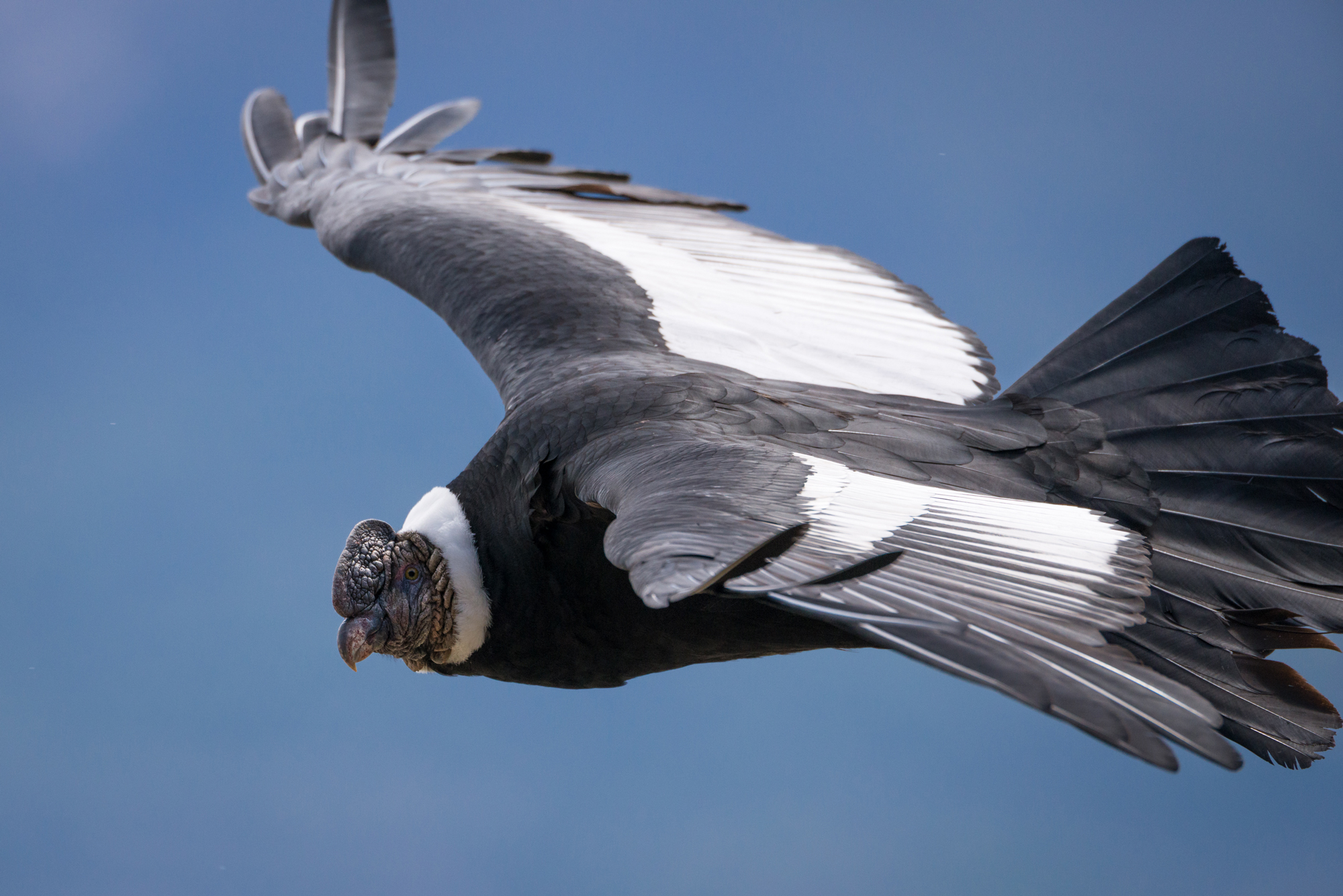 The Andean condor (Vultur gryphus) is one of the largest flying birds in the world and a symbol of power and freedom across the Andes Mountains. With an impressive wingspan that can exceed three meters (up to 10 feet), this majestic vulture soars effortlessly on thermal currents, using minimal energy to travel vast distances in search of food. Its striking black plumage, white ruff of feathers around the neck, and bare head adapted for hygiene reflect its scavenging lifestyle. As a carrion feeder, the condor plays a vital ecological role by cleaning up carcasses and helping to prevent the spread of disease.