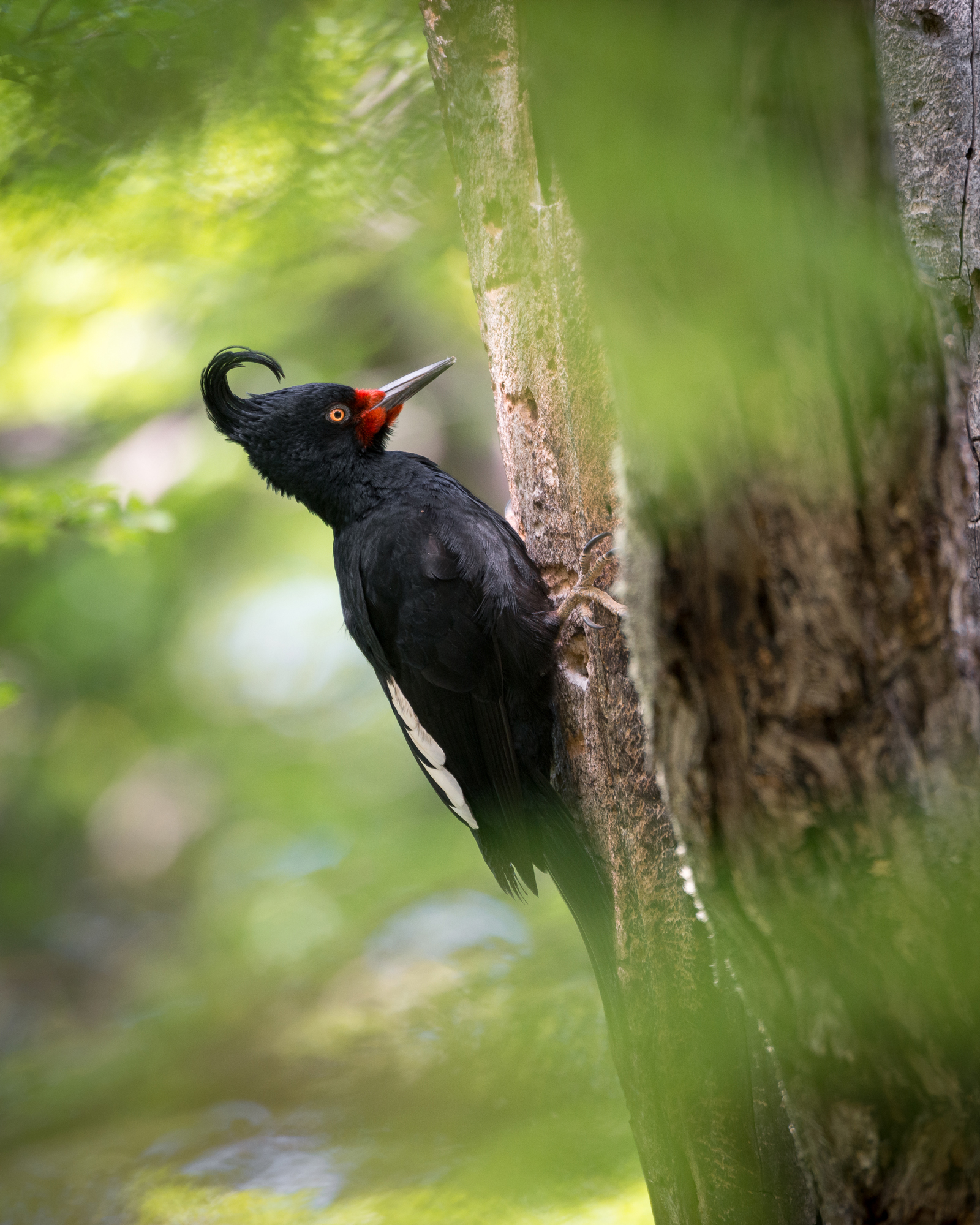 The Magellanic woodpecker (Campephilus magellanicus) is one of the largest woodpecker species in South America and a striking resident of the temperate forests of southern Chile and Argentina. Males are easily recognized by their vivid red heads, while females have a mostly black head with touches of red near the bill. Both sexes have powerful beaks and strong claws that allow them to cling to tree trunks and excavate wood in search of insects and larvae. Their loud drumming and distinctive calls echo through the forest, making them easier to hear than see in the dense canopy.
